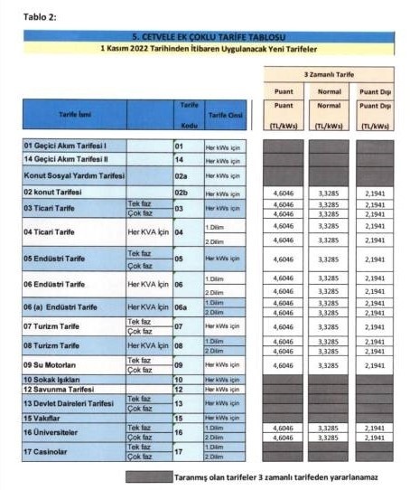 Buna göre, “kış dönemi” diye adlandırılan 16 Ekim-15 Mayıs tarihleri arasında, “normal zaman” diye adlandırılan sabah saat 07.00'den akşam üzeri 17.00'ye kadar, elektrik fiyatı Kilowatt saat (kwh) başına 3,3285 TL, “Puant” adı verilen zaman dilimi olan akşam üzeri saat 17.00'den gece 22.00'ye kadar elektrik fiyatı 4,6046 TL, “Puant Dışı” olarak adlandırılan zaman dilimi olan gece 22.00 ile sabah 07.00 saatleri arasında ise elektrik fiyatı 2,1941 TL olarak uygulanacak.