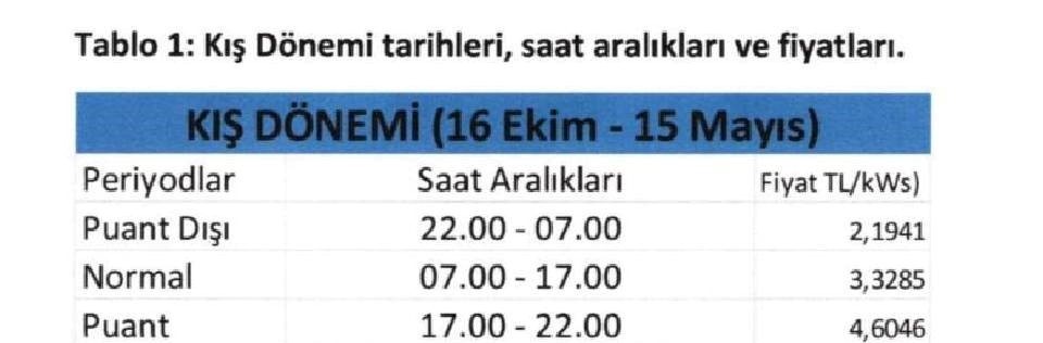 Buna göre, “kış dönemi” diye adlandırılan 16 Ekim-15 Mayıs tarihleri arasında, “normal zaman” diye adlandırılan sabah saat 07.00'den akşam üzeri 17.00'ye kadar, elektrik fiyatı Kilowatt saat (kwh) başına 3,3285 TL, “Puant” adı verilen zaman dilimi olan akşam üzeri saat 17.00'den gece 22.00'ye kadar elektrik fiyatı 4,6046 TL, “Puant Dışı” olarak adlandırılan zaman dilimi olan gece 22.00 ile sabah 07.00 saatleri arasında ise elektrik fiyatı 2,1941 TL olarak uygulanacak.