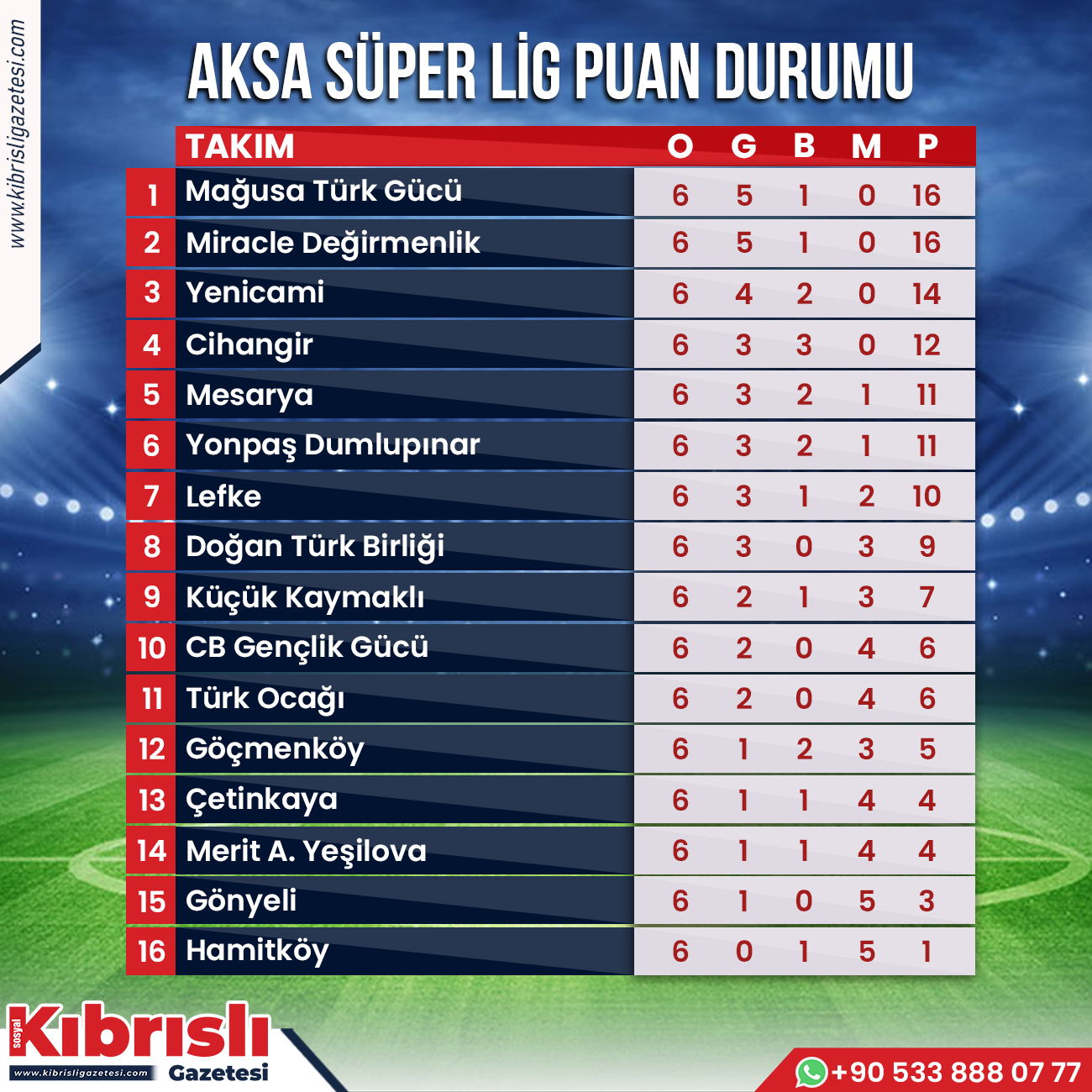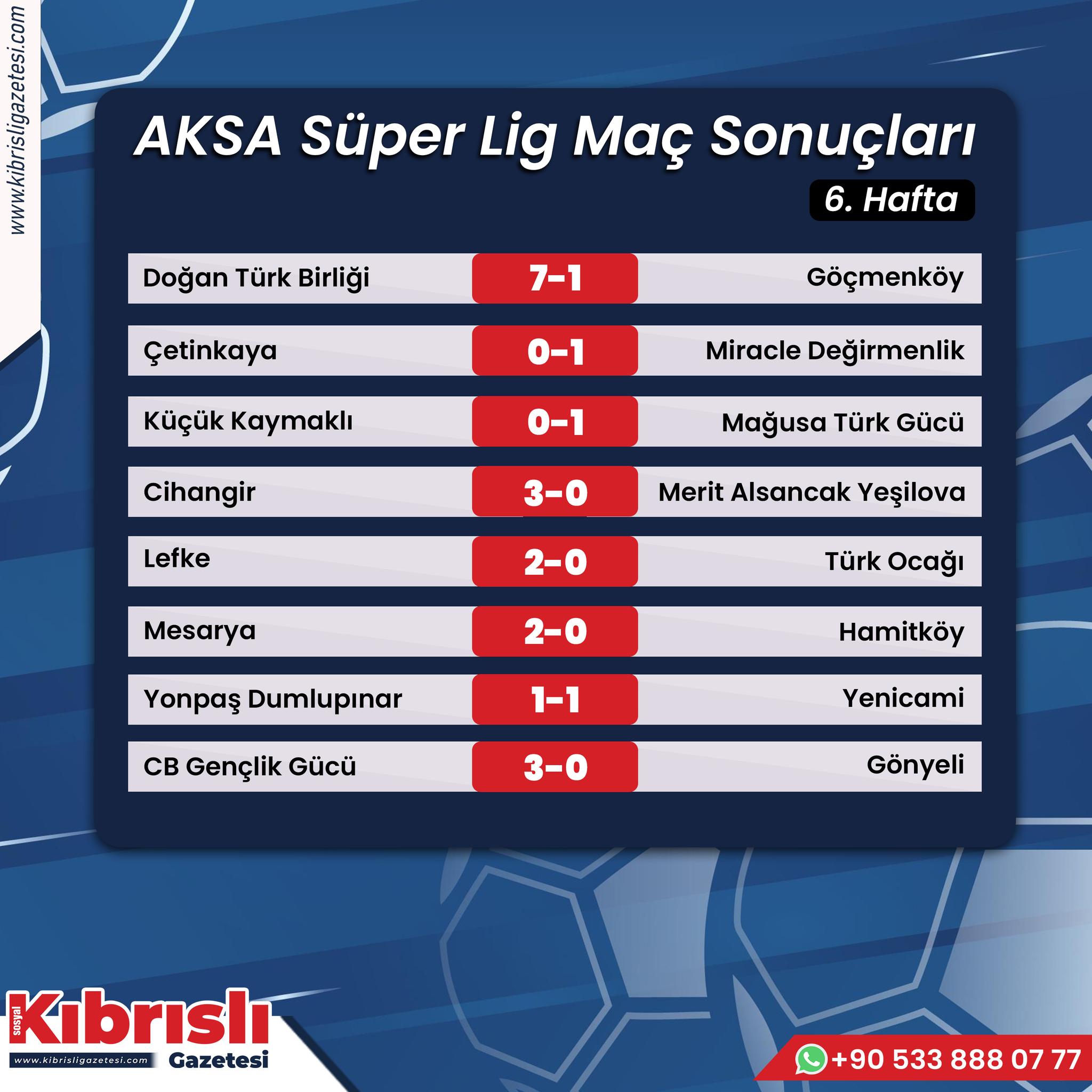 AKSA Süper Lig’de 6’ncı hafta mücadeleleri tamamlandı. Mağusa Türk Gücü averajla liderliğini sürdürdü. Sarı-yeşilliler hafta sonu konuk olduğu Küçük Kaymaklı’yı 1-0’lık skorla yenmeyi başardı. Sezona yaptığı transferlerle hızlı bir giriş yapan Miracle Değirmenlik ise deplasmanda Çetinkaya’yı 1-0’lık skorla yenerek, averajla ikinci sırada haftayı tamamladı.